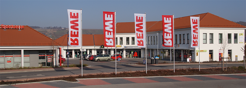 Zwischen den beiden Gemeinden Stadecken und Elsheim wurde das Dorfzentrum oder Dorfmittelpunkt, sozusagen als Bindeglied oder Brücke zwischen den beiden Ortsteilen, errichtet. Die Straße, die hier im Bildvordergrund an den Geschäftsgebäuden vorbeiführt, ist die Bovoloner Alle. Die Bäume, die die Straße zur Allee machen, sind noch sehr klein oder noch gar nicht vorhanden.